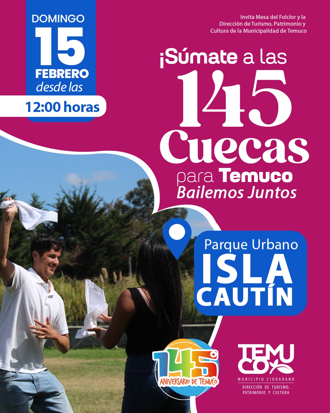 Temuco se prepara para celebrar su aniversario al ritmo de la cueca. Este domingo 15 de febrero, a partir de las 12:00 horas, el Parque Urbano Isla Cautín será escenario de “145 Cuecas para Temuco”, una cita que ya se instaló como tradición y que vuelve a reunir a vecinos, familias y amantes del folclor en una verdadera fiesta ciudadana.