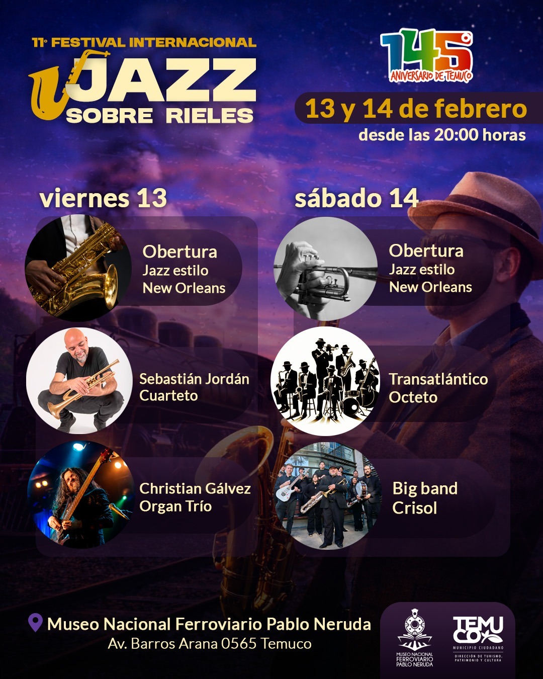 Este 13 y 14 de febrero, desde las 20:00 horas, la ciudad celebra sus 145 años con el 11º Festival Internacional Jazz sobre Rieles, un encuentro gratuito y familiar en el Museo Nacional Ferroviario Pablo Neruda (Av. Barros Arana 0565). Entrada liberada.