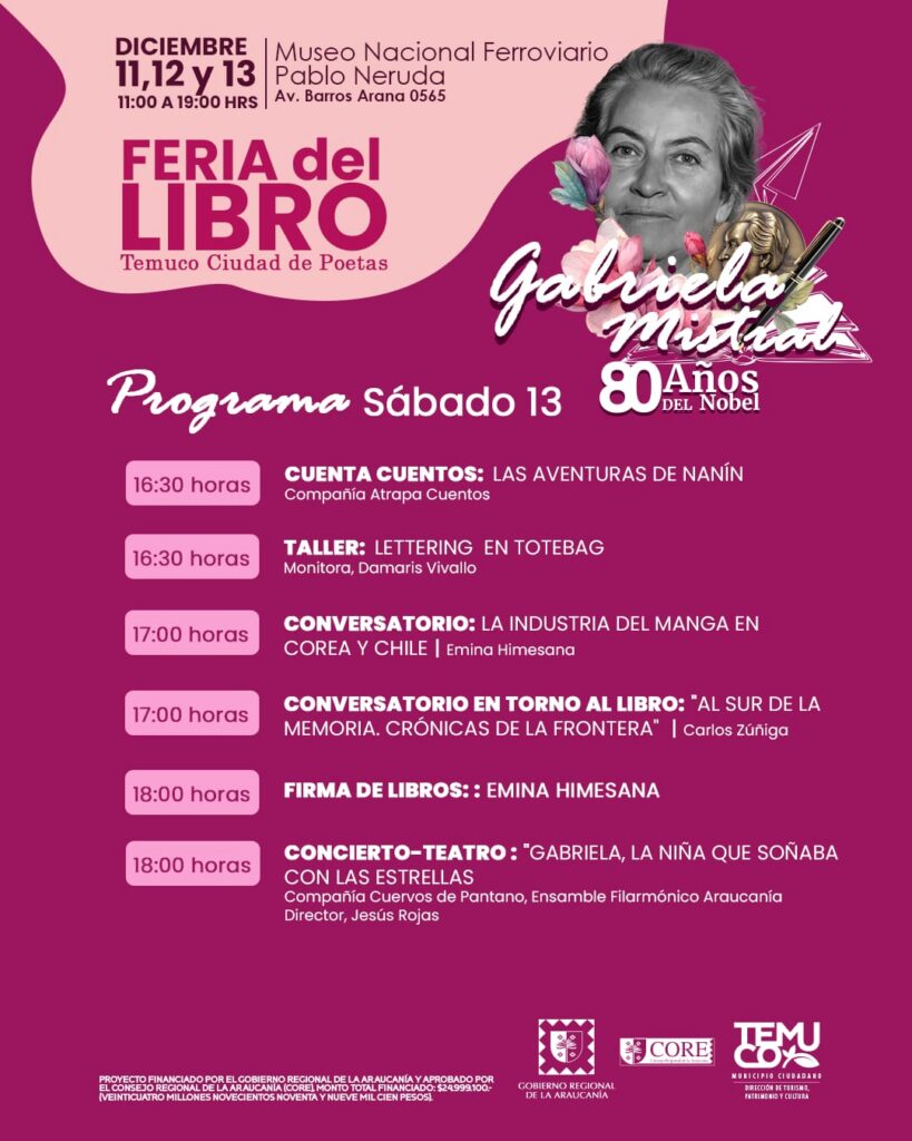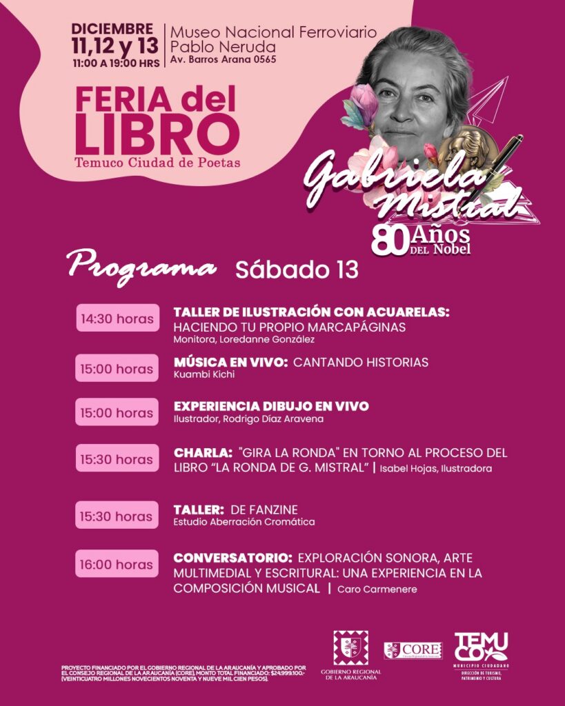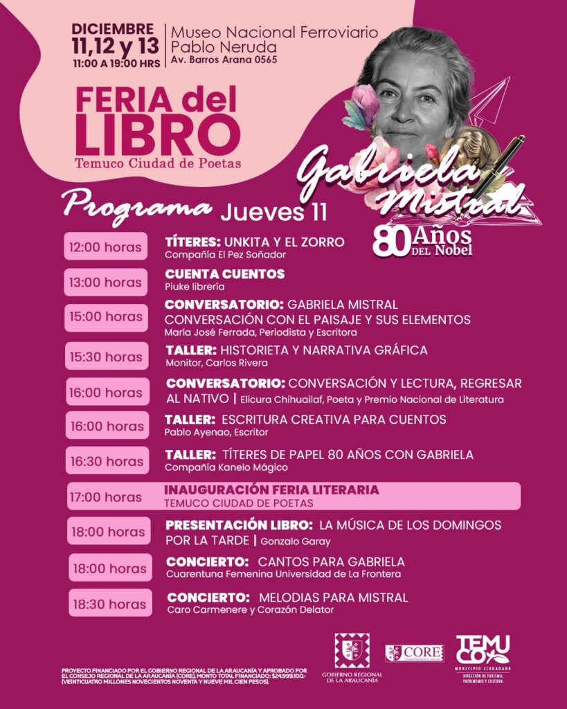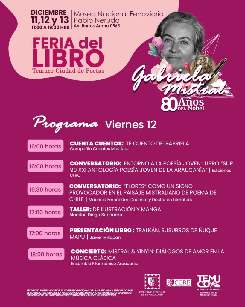 La feria contará con la participación de dos Premios Nacionales de Literatura: Hernán Rivera Letelier y Elicura Chihuailaf, además de destacados escritores, ilustradores y agrupaciones artísticas.La primera versión de la Feria del Libro “Temuco, Ciudad de Poetas” se realizará los días 11, 12 y 13 de diciembre, entre las 11:00 y las 19:00 horas, en el Museo Nacional Ferroviario Pablo Neruda (Av. Barros Arana 0565). La actividad, organizada por la Municipalidad de Temuco a través de su Dirección de Turismo, Patrimonio y Cultura, se enmarca en la conmemoración de los 80 años del Premio Nobel de Literatura otorgado a Gabriela Mistral. El encuentro literario, financiado por el Gobierno Regional de La Araucanía y aprobado por el Consejo Regional (CORE), reunirá más de 30 stands de emprendimientos, librerías y editoriales provenientes de las regiones del Biobío, Valparaíso, Metropolitana y diversas comunas de La Araucanía, junto a destacadas figuras del ámbito literario, artístico y académico del país.El alcalde de Temuco, Roberto Neira Aburto, invitó a la comunidad a ser parte de esta celebración cultural. “Como municipio estamos orgullosos de contar con una instancia cultural de esta envergadura, que hoy rinde un homenaje merecido a una figura fundamental de la literatura y de la identidad chilena como lo es Gabriela Mistral. A través de esta feria buscamos que su legado se proyecte hacia las nuevas generaciones, fortaleciendo el vínculo de nuestra ciudad con la poesía, sus creadores y nuestro legado literario”, expresó el edil.Durante las tres jornadas, el público podrá participar de lanzamientos de libros, conversatorios, conferencias, presentaciones artísticas, cuentacuentos, títeres, talleres creativos y conciertos, junto a reconocidos invitados como los Premios Nacionales de Literatura Elicura Chihuailaf y Hernán Rivera Letelier; la destacada escritora María José Ferrada; la ilustradora Isabel Hojas; Emina Himesana, autora y dibujante de manga; además de diversos ilustradores, escritores, compañías escénicas y agrupaciones musicales.Hernán Rivera Letelier, escritor y también Premio Nacional de Literatura, comentó que, “Temuco es una ciudad de poetas; así lo demuestra el paso de nuestros premios Nobel, cuyo vínculo con este territorio les sirvió de inspiración y le otorgó a la región una identidad literaria indiscutible. Pero también lo confirma el presente vigoroso de muchas y muchos que hoy se consolidan como voces prominentes de la literatura chilena.”“Para nosotros, como editorial independiente que recoge la escritura de regiones, nos parece fundamental contar con iniciativas que valoren y proyecten el trabajo literario que existe en una región que posee una enorme tradición poética y donde hay una verdadera cuna de grandes creadores y creadoras que expresan, desde esta tierra llena de contradicciones, una visión propia y profundamente significativa”, señaló Luis Riffo, editor de Editorial Bogavantes.La programación, disponible en www.destinotemuco.cl,  también incorpora el 2º Festival de Video Poesía “Estación Verso Imágenes”, además de espacios formativos para la ilustración, narrativa gráfica, escritura creativa, cómic, manga, acuarela y lettering, con actividades pensadas para todas las edades.