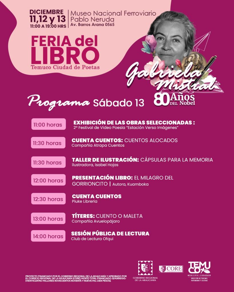 La primera versión de la Feria del Libro “Temuco, Ciudad de Poetas” se realizará los días 11, 12 y 13 de diciembre, entre las 11:00 y las 19:00 horas, en el Museo Nacional Ferroviario Pablo Neruda (Av. Barros Arana 0565). La actividad, organizada por la Municipalidad de Temuco a través de su Dirección de Turismo, Patrimonio y Cultura, se enmarca en la conmemoración de los 80 años del Premio Nobel de Literatura otorgado a Gabriela Mistral. El encuentro literario, financiado por el Gobierno Regional de La Araucanía y aprobado por el Consejo Regional (CORE), reunirá más de 30 stands de emprendimientos, librerías y editoriales provenientes de las regiones del Biobío, Valparaíso, Metropolitana y diversas comunas de La Araucanía, junto a destacadas figuras del ámbito literario, artístico y académico del país.