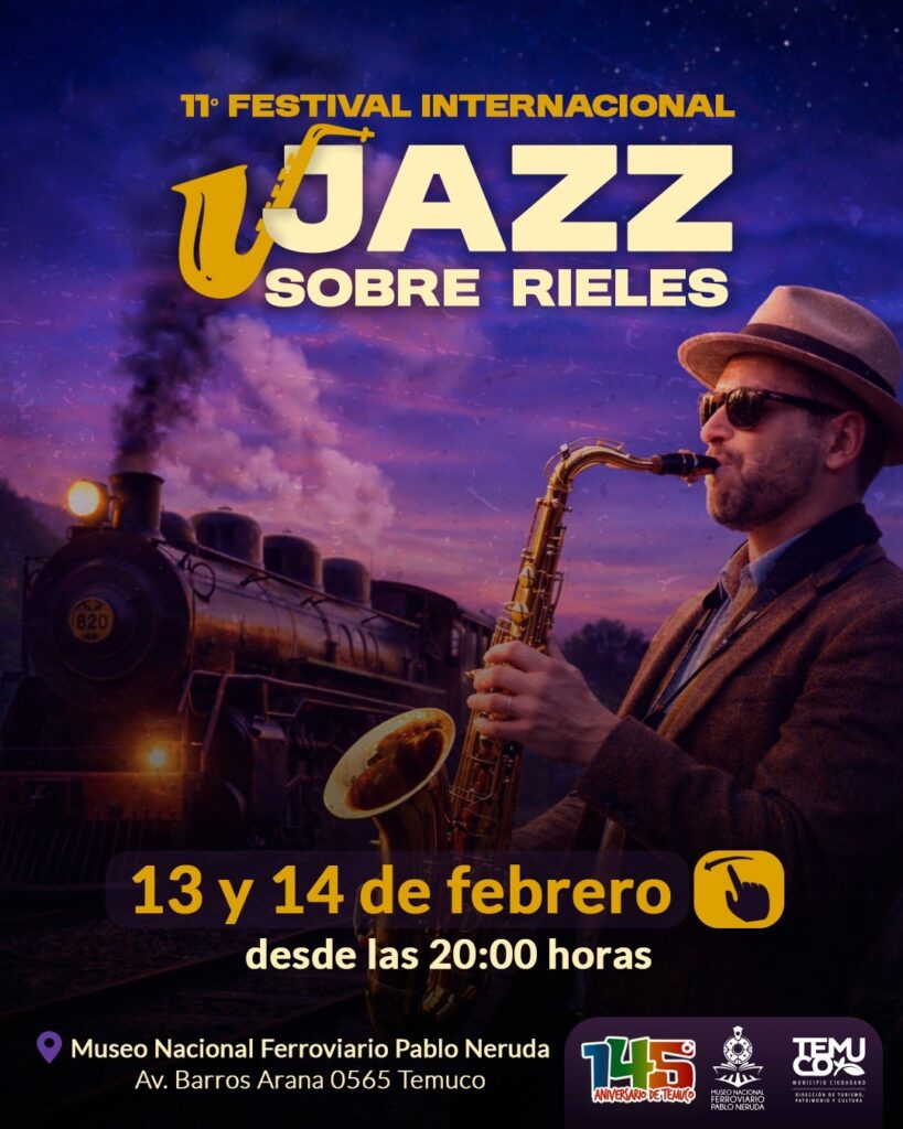 Temuco se prepara para vivir dos noches especiales de música y cultura con una nueva edición del Festival Internacional Jazz sobre Rieles, uno de los panoramas musicales más esperados por la comunidad. El histórico Museo Nacional Ferroviario Pablo Neruda volverá a transformarse en un escenario único para disfrutar jazz en vivo al aire libre con destacados exponentes, en un ambiente patrimonial y cercano, ideal para venir con familia y amigos.