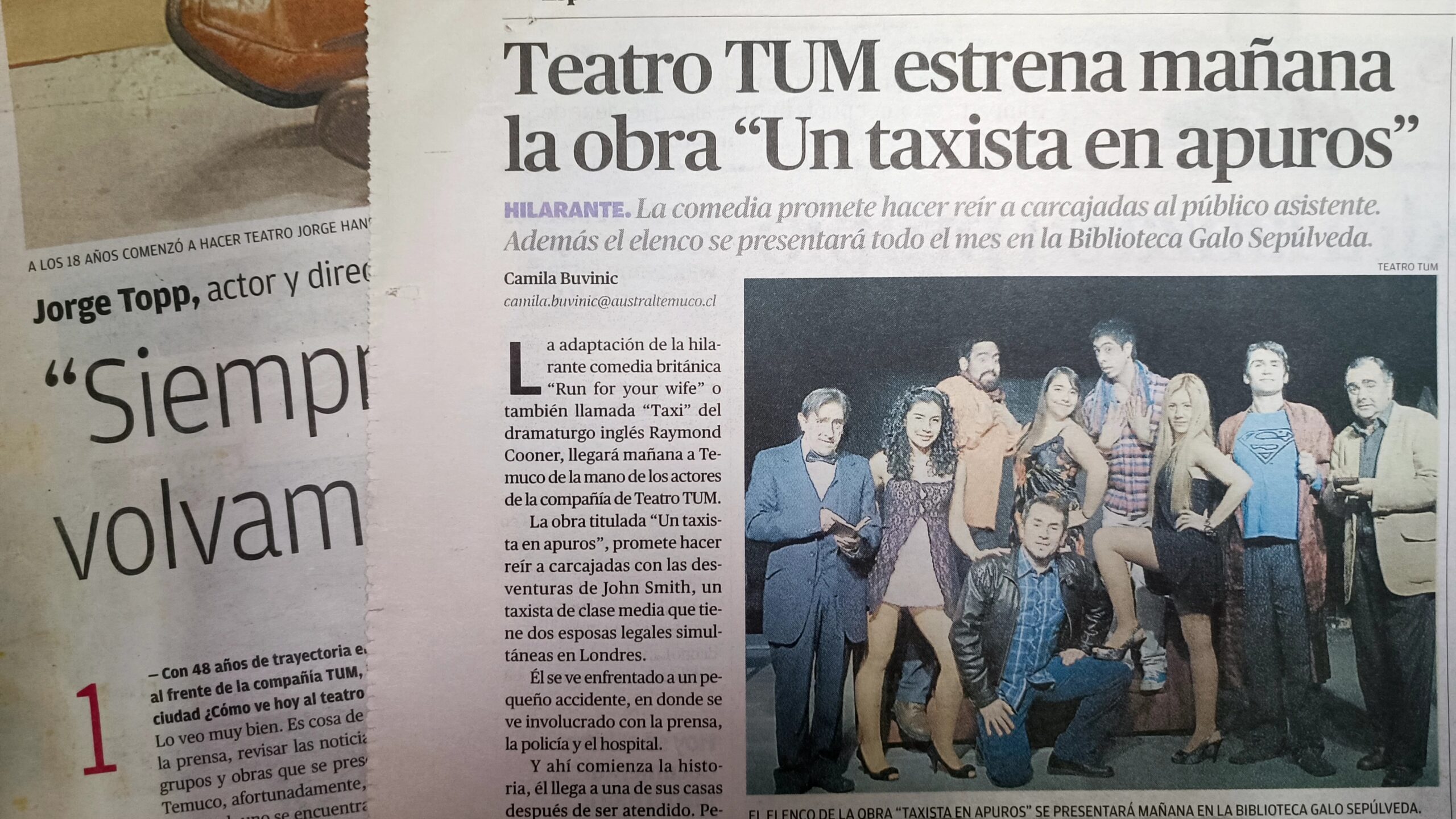 Después de trabajar por más de 15 años como actor, Jorge nos cuenta que nació la inquietud de preparar actores en la escena local. “Fui a Santiago a estudiar durante 3 años docencia teatral, me especialicé en esta área y comencé a dirigir, lo que me permitió fundar en 1978 la compañía de Teatro Universitario Municipal, más conocida como el TUM, una de las compañías más longevas que se mantiene vigente de Concepción hacia el sur de Chile y que nace producto de la fusión del taller de teatro de la Universidad de Chile y el teatro de la municipalidad, que en esa época estaba financiado por la administración municipal de aquella época”, explicó.