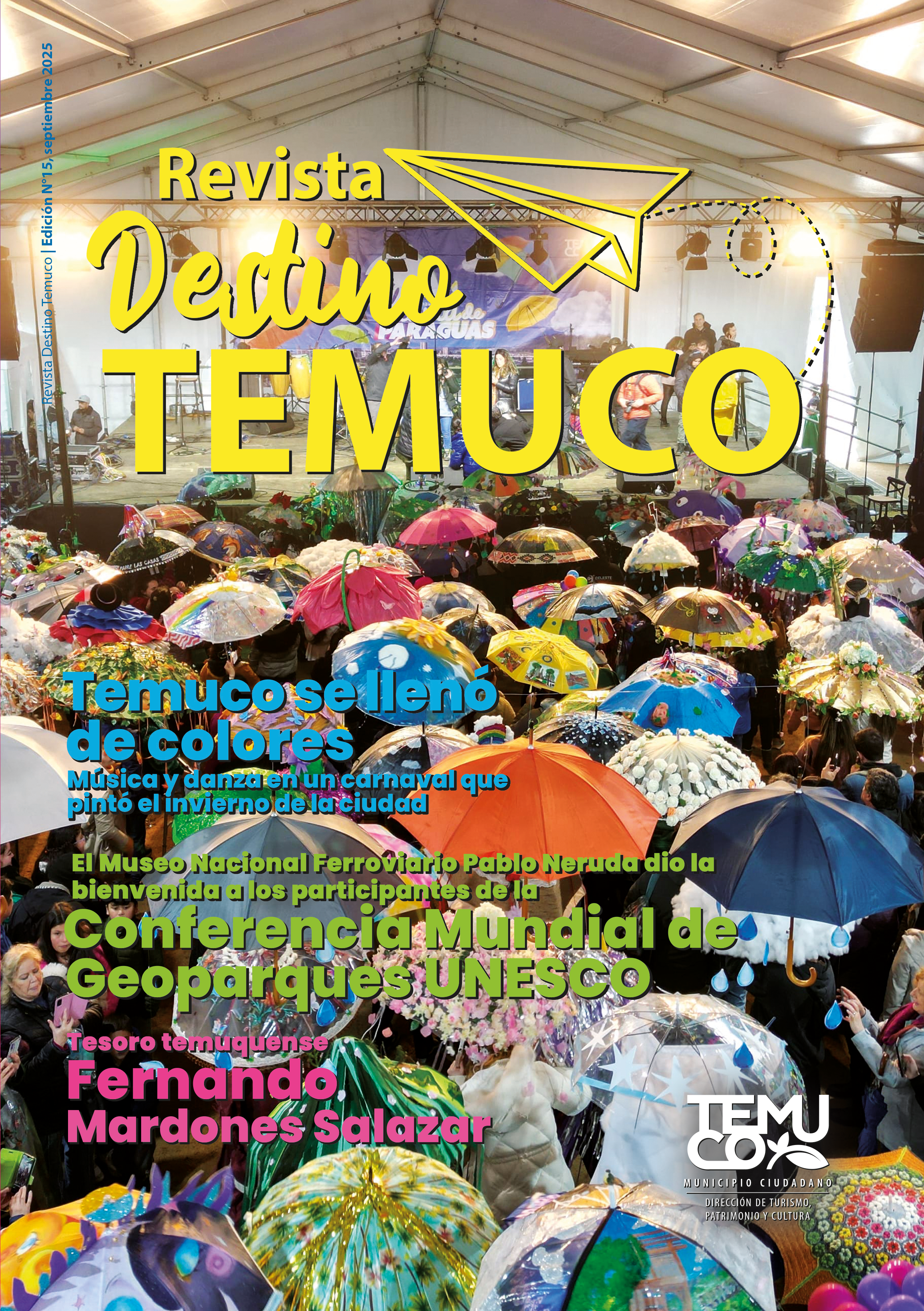 Hoy quiero contarles que estamos muy contentos, porque logramos hacer de Temuco una ciudad que ofrece un variado programa cultural y turístico durante todo el año y, lo más importante, es que hemos contado con la activa participación de la ciudadanía. Así lo hemos vivenciado en las diversas actividades que desarrollamos en estos meses, donde quisiera destacar el “Carnaval lluvia de paraguas”, evento que convocó la masiva asistencia de las familias de Temuco.